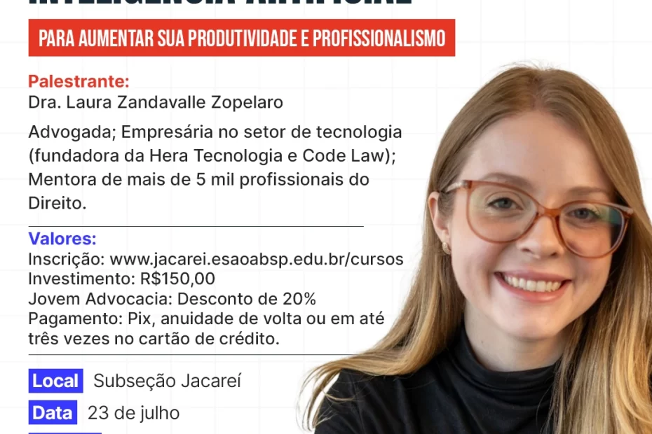 A OAB Jacareí te convida para o curso “ChatGPT para Advogados: como utilizar a Inteligência Artificial para aumentar sua produtividade e profissionalismo”, com a Dra. Laura Zandavalle Zopelaro — advogada, empresária no setor de tecnologia e mentora de mais de 5 mil profissionais do Direito. ⚖️🤖