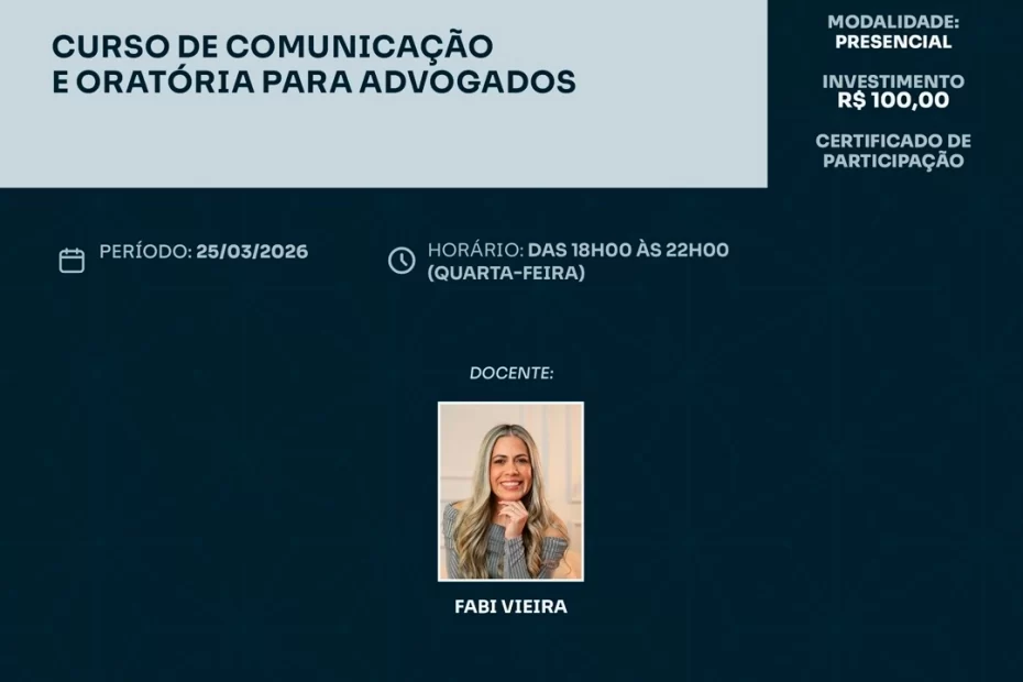 A comunicação é uma das ferramentas mais poderosas da advocacia! No dia 25/03/2026 (quarta-feira), das 18h às 22h, a ESA/OAB Jacareí promove o Curso de… Continue a ler »Curso de Comunicação e Oratória para Advogados